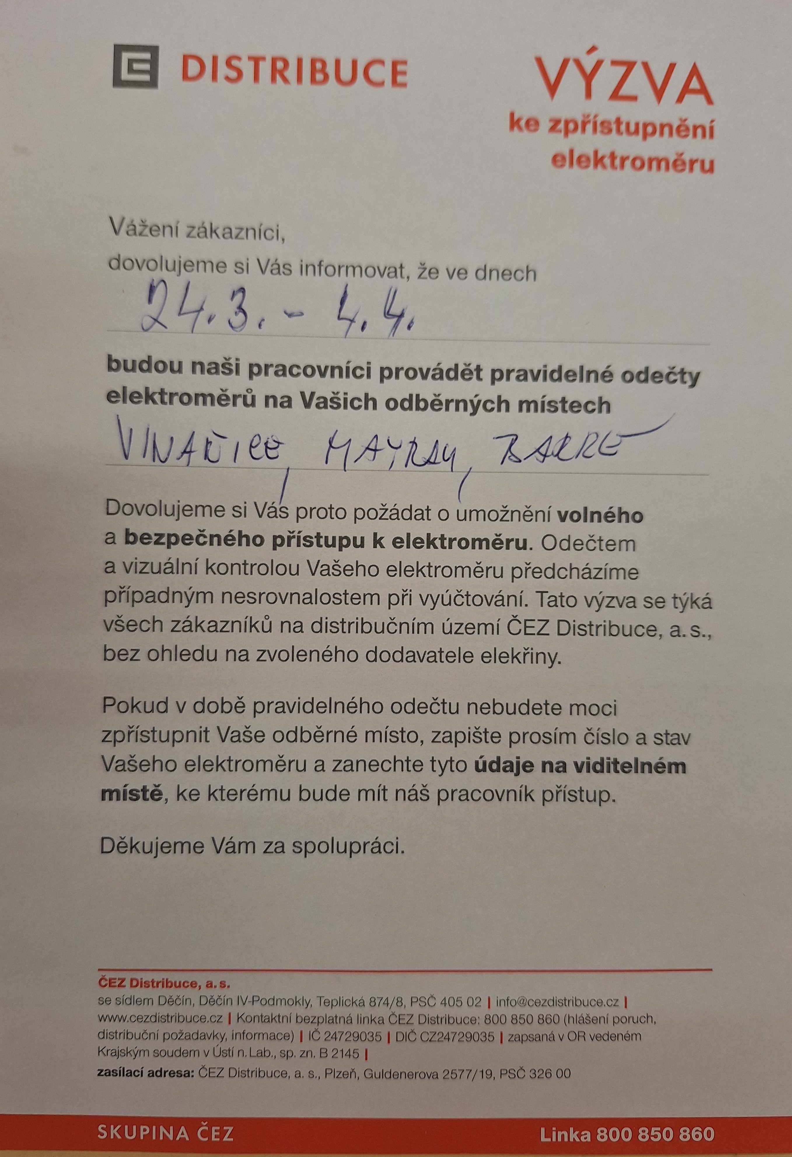 Dovolujeme si Vás informovat, že ve dnech 24. 3. až 4. 4. 2025 budou naši pracovníci provádět pravidelné odečty elektroměrů na Vašich odběrných místech. Podrobnosti jsou uvedeny v příloze. ČEZ Distribuce a.s.
